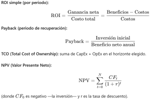 - Calcular ROI simple y Payback; si requiere, calcular NPV o IRR con una tasa de descuento.