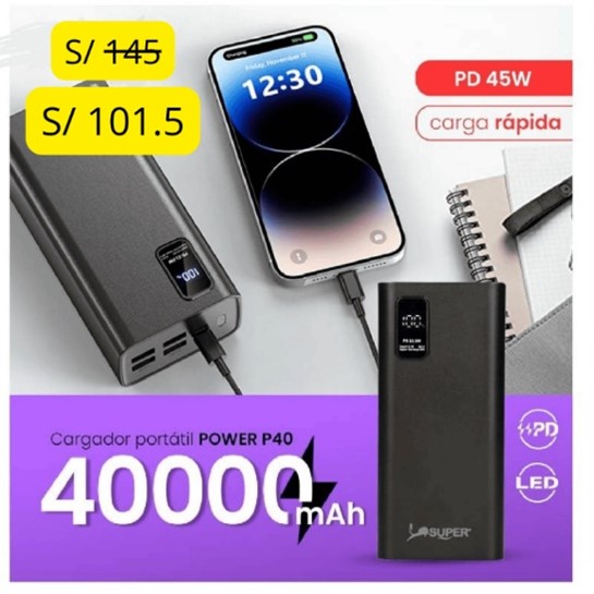 Batería Externa de 40000mAh 45W Super Carga Rápida Batería de alta capacidad y larga vida. Diseño ultra ligero. Super carga rápida. Protección sobrecarga. 4 puertos de salida y 2 puertos de entrada. Puedes cargar 5 celulares a la vez. Pantalla digital indicador de batería. Se emite boleta con garantía.